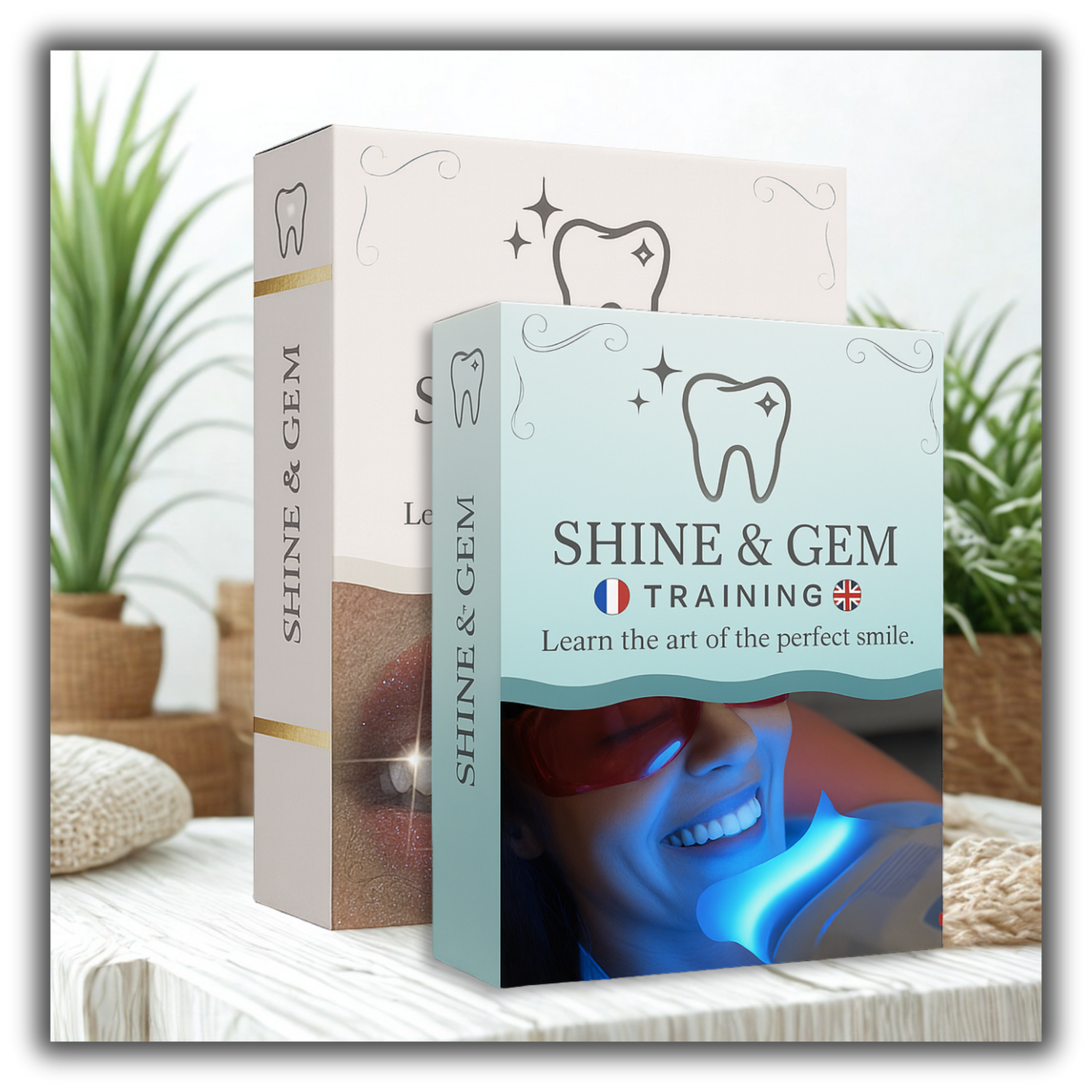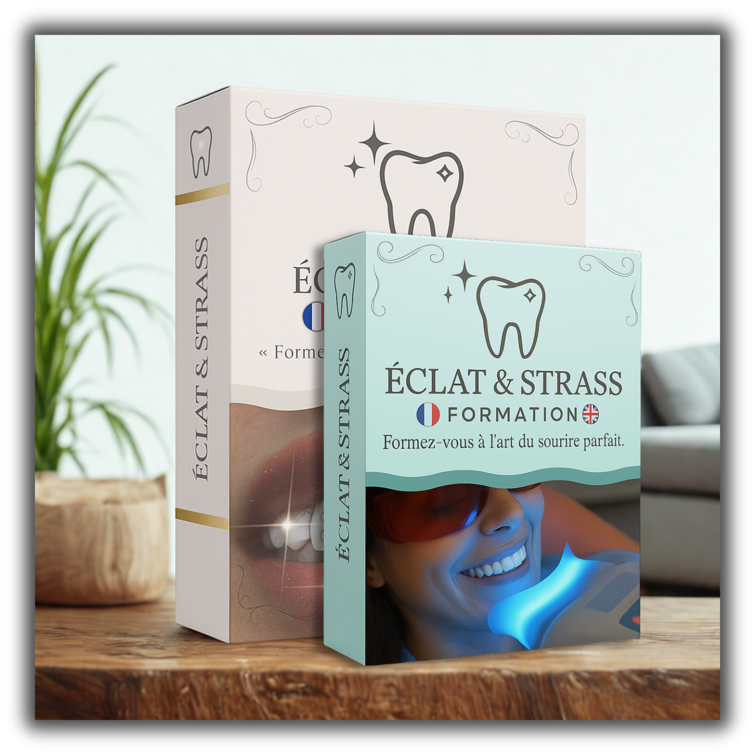 Le pack de formation complète réunit nos deux programmes : strass dentaire et blanchiment dentaire. Tout le matériel nécessaire est inclus dans le prix, avec un accès immédiat aux deux formations en ligne.